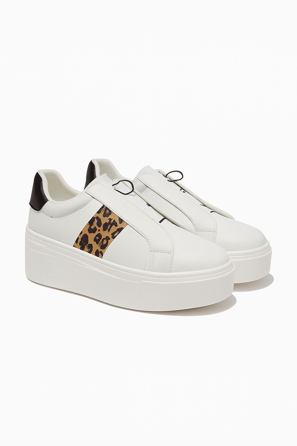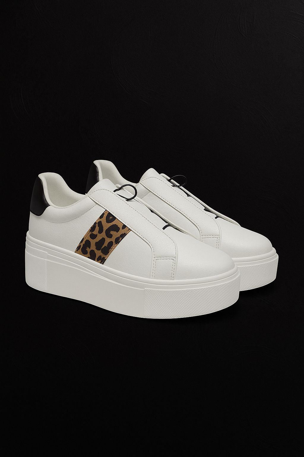 These white faux-leather trainers feature a bold leopard print stripe on the side, adding a touch of modern edge to your everyday look. Designed with a chunky sole for extra height and comfort, they’re ideal for pairing with jeans, dresses, or casual sets.